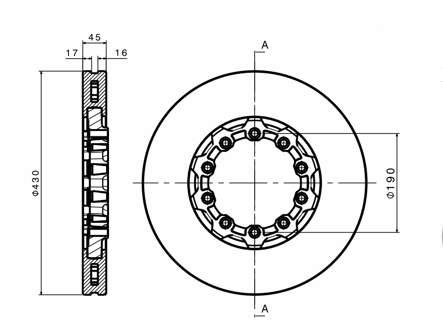 Flat Brake Disk type S Product info Table Inner Disc Section Outer Disc Section Weight Product NO. GGG50 GG25 28.5 Kg 41110310001 Inner Disc Section GGG50 Outer Disc Section GG25 Weight 28.5 Kg Product NO. 41110310001